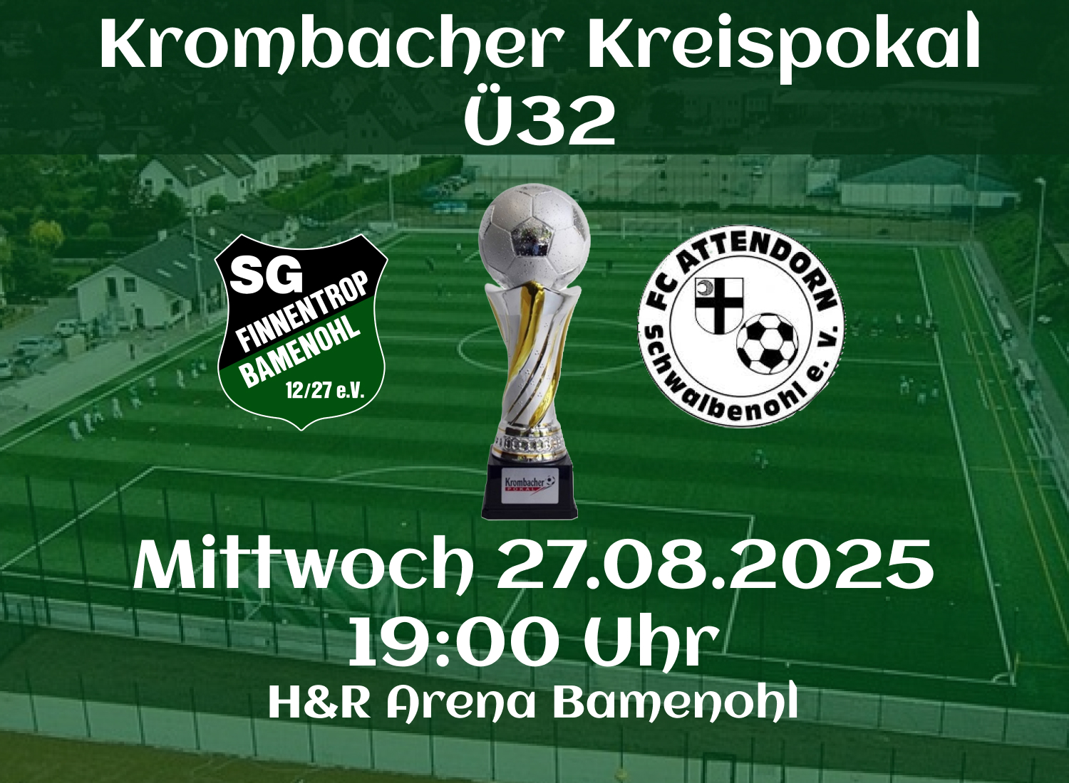 Auch in diesem Jahr nimmt unsere Ü32 Truppe wieder am Kreispokal teil. Dazu begrüßen wir am morgigen Abend den FC Attendorn-Schwalbenohl in der H&R Arena.